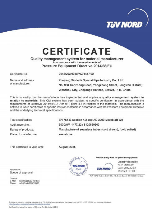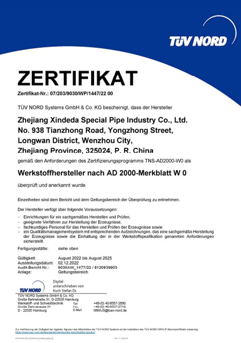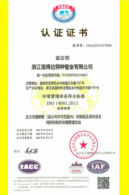 公司已全面通過了ISO9001:2008質(zhì)量管理體系認(rèn)證、14000環(huán)境管理體系認(rèn)證、18000職業(yè)健康管理體系認(rèn)證、國家質(zhì)量檢驗檢疫總局A2-B類壓力管道元件制造許可、 歐盟PED認(rèn)證及德國AD-2000產(chǎn)品強(qiáng)制認(rèn)證、美國ASME材料產(chǎn)品認(rèn)證、信得達(dá)擁有1條穿孔生產(chǎn)線,10條冷拔生產(chǎn)線8條冷軋?zhí)胤N無縫鋼管生產(chǎn)線。